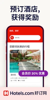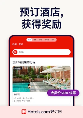 Hotels.com 好订网 App 为您的每一次出行增添非凡价值。通过本应用,您将解锁遍布全球十万余家酒店的会员专属礼遇,享受高达九折或更优的房价*。每一次住宿,无论规模大小,均能在全球逾五十万家合作住宿中累积宝贵奖励,让您的每一次旅行都物超所值。进阶的 Silver 和 Gold 会员更能优先体验精选 VIP Access 酒店的额外专属服务,享受定制化的奢华体验。我们将每一次旅行化为一次次收获与惊喜的旅程。